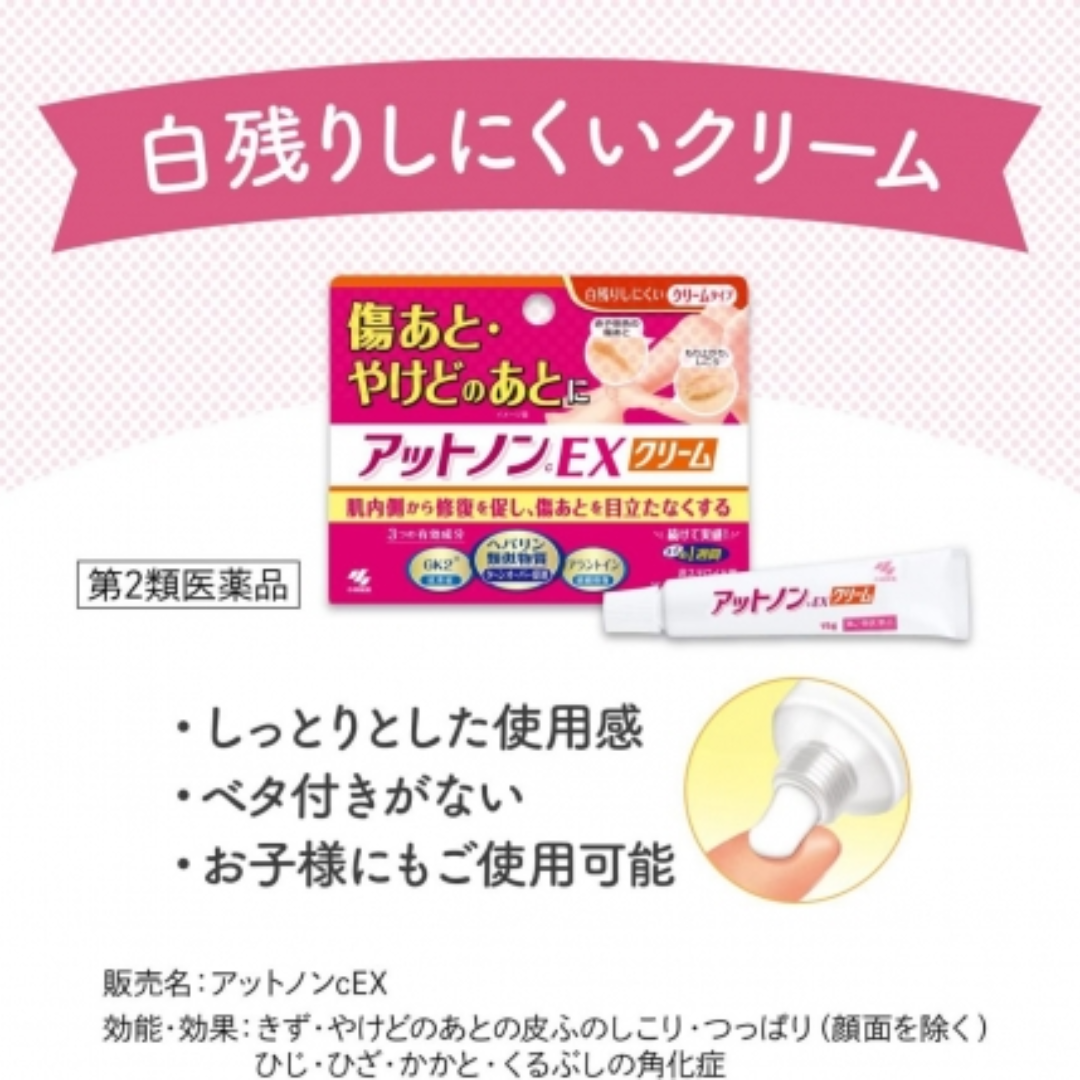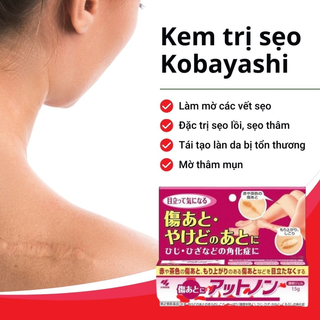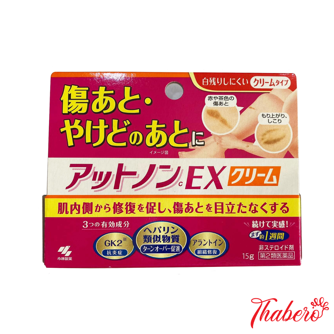 Kem trị sẹo Attonon EX của Kobayashi là một loại dược phẩm (Loại 2) nội địa Nhật Bản, được thiết kế chuyên biệt để điều trị các vết sẹo sau tổn thương như sẹo do vết thương, sẹo bỏng. Sản phẩm hoạt động bằng cách thúc đẩy tái tạo da từ bên trong, làm mờ sẹo và cải thiện tình trạng da.
