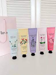 - Chiết xuất hoa: Mỗi tuýp kem chứa chiết xuất từ loại hoa tương ứng với mùi hương (ví dụ: chiết xuất hoa loa kèn, hoa hồng leo, hoa sen, hoa mẫu đơn, hoa oải hương) để tạo mùi thơm dễ chịu và thư giãn.
