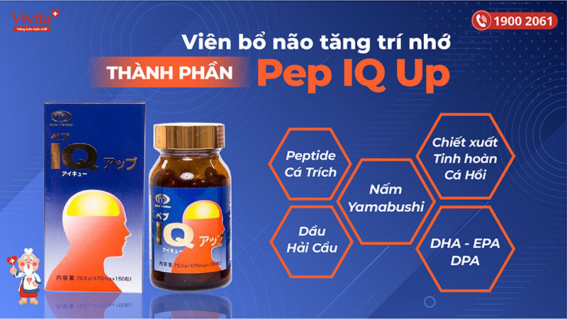 Viên uống Pep IQ Up được làm từ các thành phần tự nhiên cao cấp và lành tính như peptide cá trích, nấm Yumabushitake , dầu hải cẩu,…phù hợp để sử dụng hàng ngày để hỗ trợ tăng cường trí nhớ cho đa dạng độ tuổi. Viên bổ não tăng cường trí nhớ Pep IQ Up được sản xuất bởi tập đoàn Inter Techno tại Nhật Bản