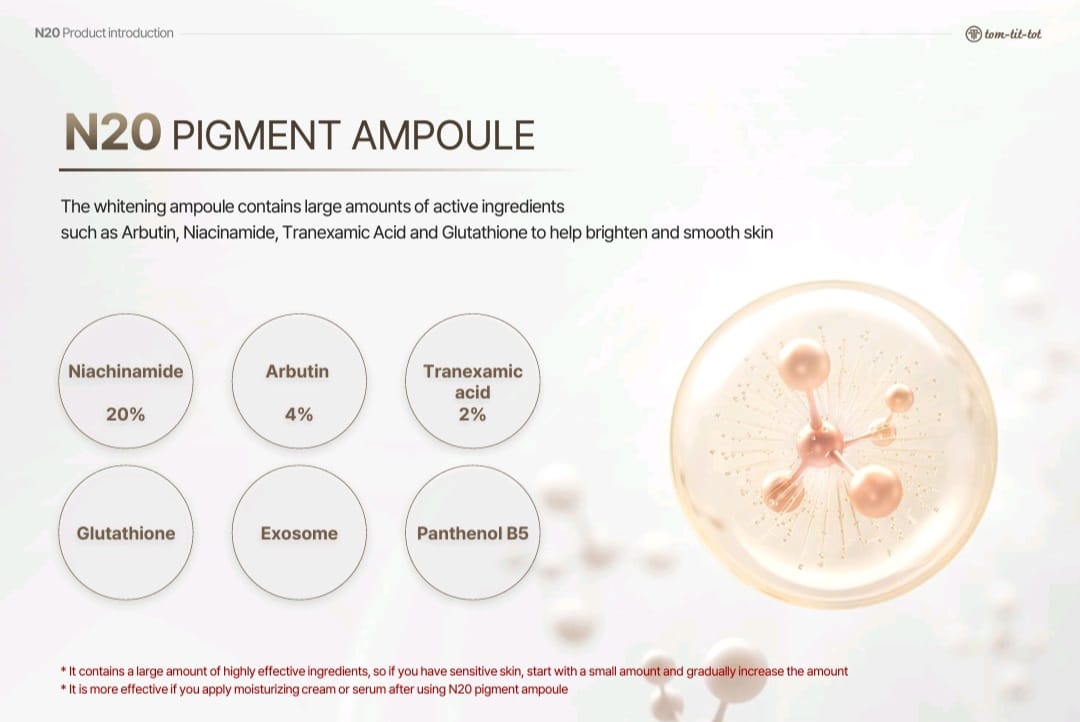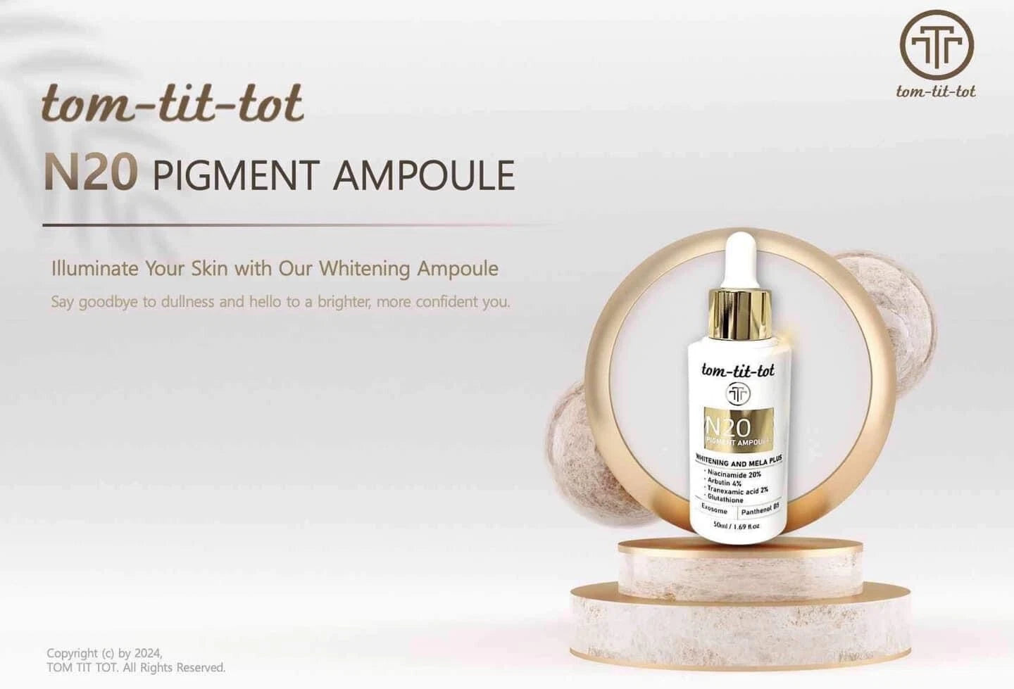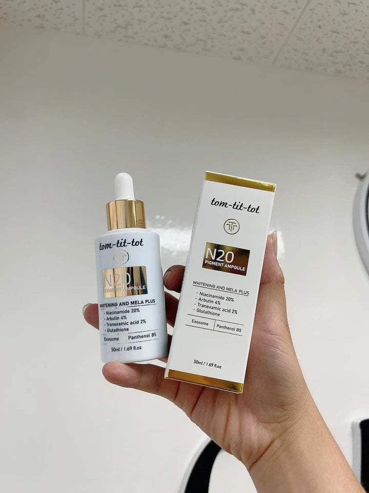 Ampoule giảm nám trắng da n20 Tomtittot 50ml đây là một loại tinh chất (ampoule) với hàm lượng các hoạt chất trị nám và dưỡng trắng cao, được thiết kế để cải thiện các vấn đề về sắc tố da (nám, thâm, không đều màu) và mang lại làn da trắng sáng, căng bóng.