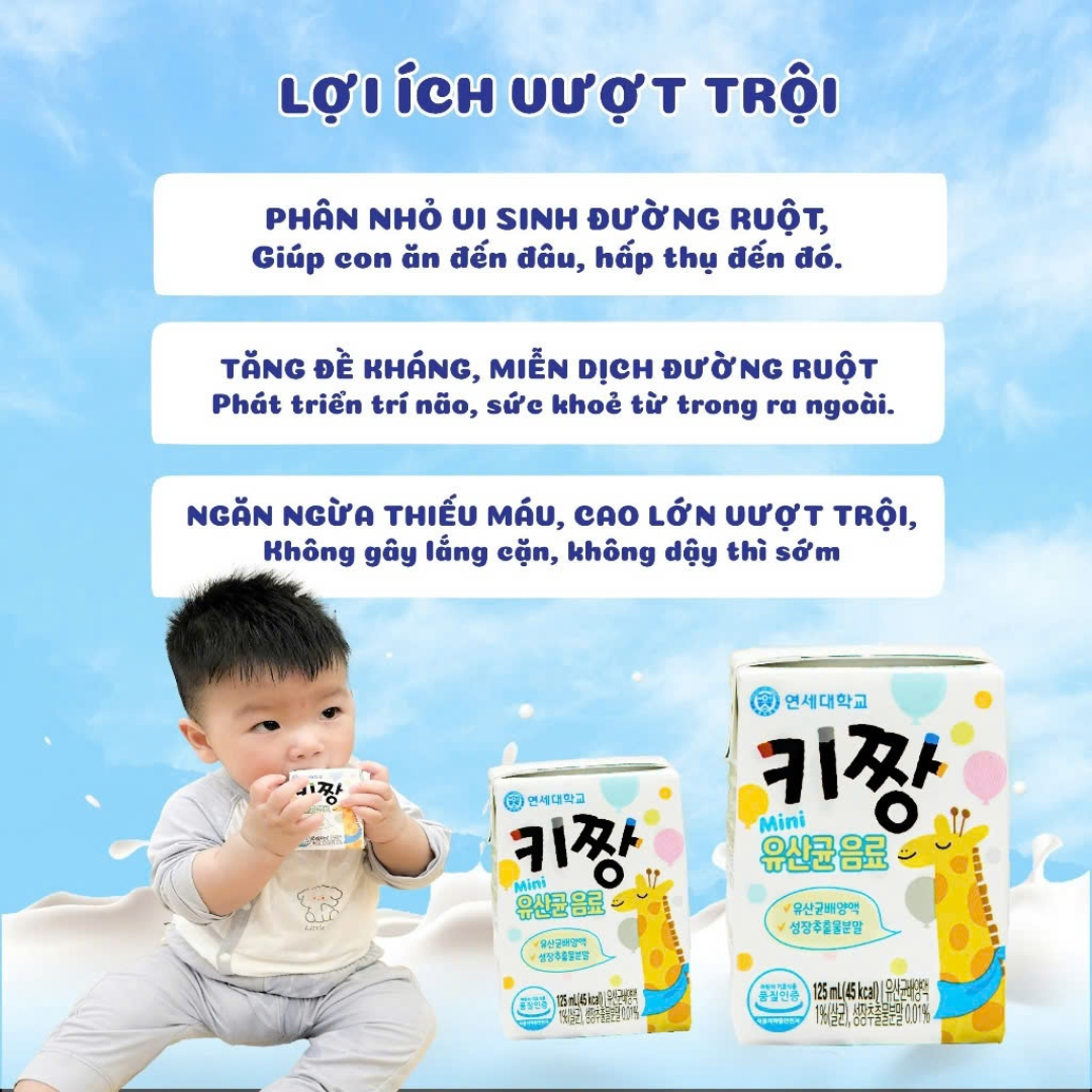 Sữa men Ki-Jjang là dòng thức uống dinh dưỡng được nghiên cứu và phát triển bởi Yonsei University Dairy - thương hiệu sữa thuộc trường đại học danh tiếng hàng đầu Hàn Quốc. Sản phẩm được thiết kế chuyên biệt để giải quyết nỗi lo của các mẹ về vấn đề biếng ăn, kém hấp thu và chậm lớn ở trẻ.