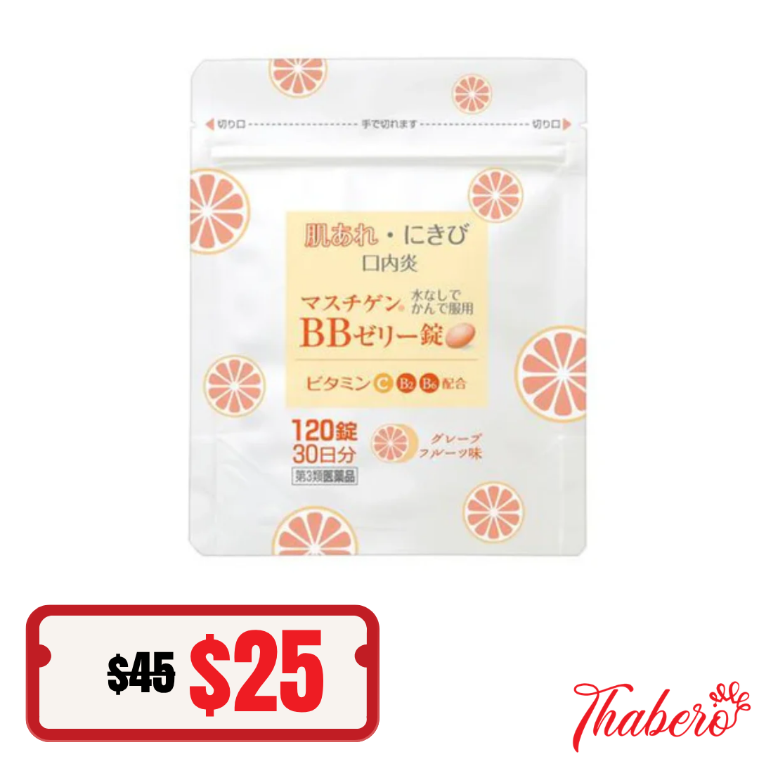 Viên nhai dạng thạch bổ sung Vitamin B2, B6 và Vitamin C giúp sản sinh collagen hình thành da và chữa viêm da giãm da thô ráp, mụn viêm và loét miệng Mastigen BB Jelly Tablets